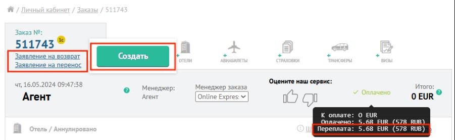 1. В заказе с переплатой доступны ссылки: ЗАЯВЛЕНИЕ НА ПЕРЕНОС.