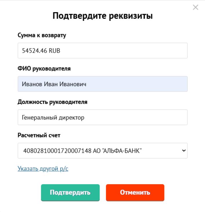 - Расчетный счет для возврата (один или несколько) предлагаются автоматически. Можно выбрать расчетный счет из предложенных или указать свой вариант (указав также БИК банка).