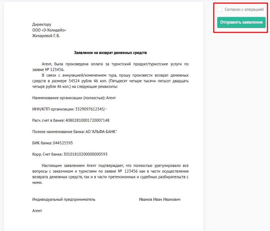 Данные заполнены автоматически. Необходимо нажать «Согласен с операцией» и «Отправить заявление». Данные по заявлению уходят в обработку.