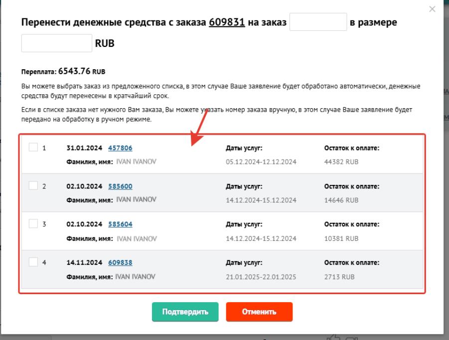 4. Необходимо выбрать нужный заказ из списка заказов с возможными суммами для переноса или указать номер заказа вручную (если в списке нет нужного заказа).